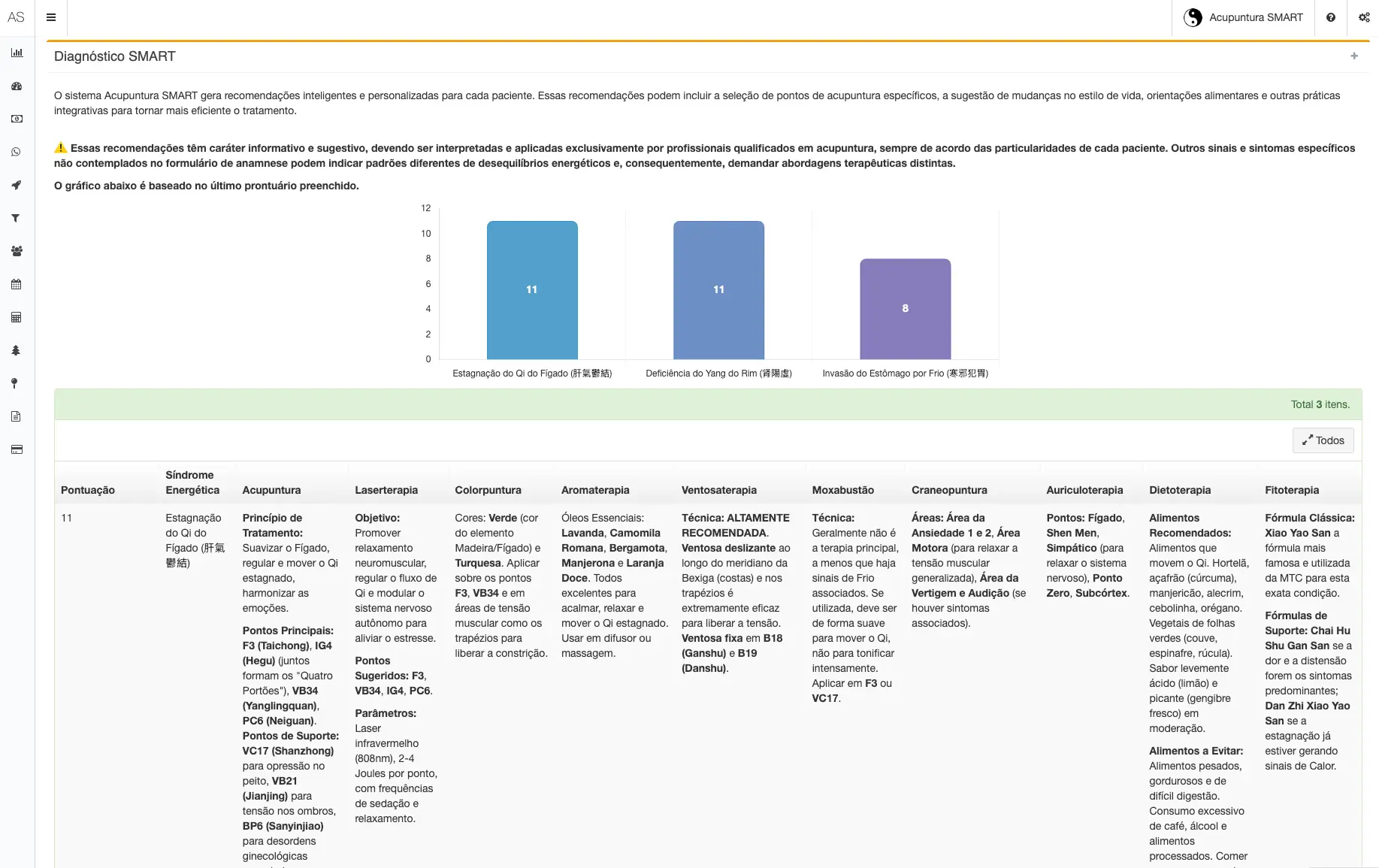 - Prontuário Eletrônico com IAO “Diagnóstico SMART (IA)” analisa o prontuário de MTC e sugere padrões de desequilíbrio, pontos e protocolos.